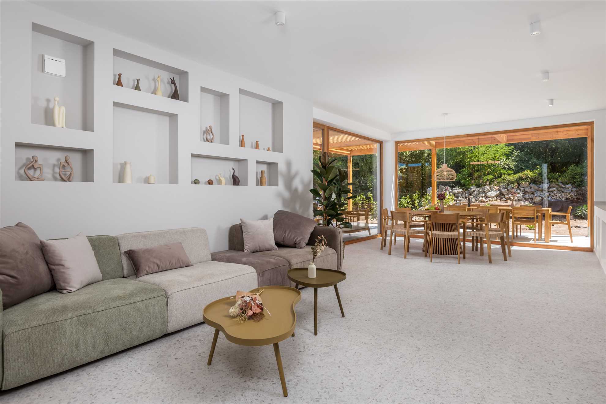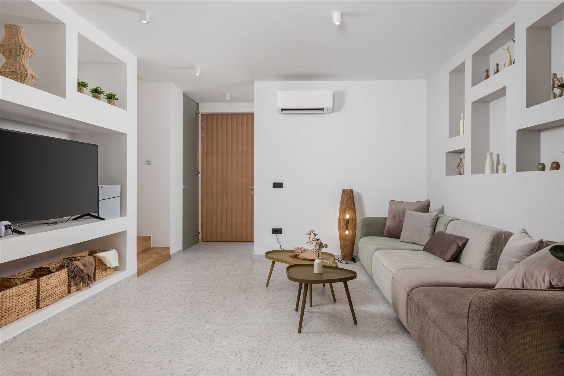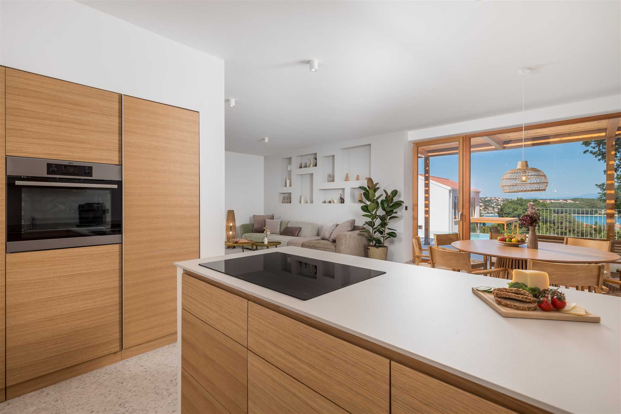 The open-plan living area features contemporary furnishings and large windows that flood the space with natural light and offer stunning sea vistas. A state-of-the-art kitchen, fully equipped with high-end appliances, flows seamlessly into the dining area, perfect for preparing and enjoying meals together.