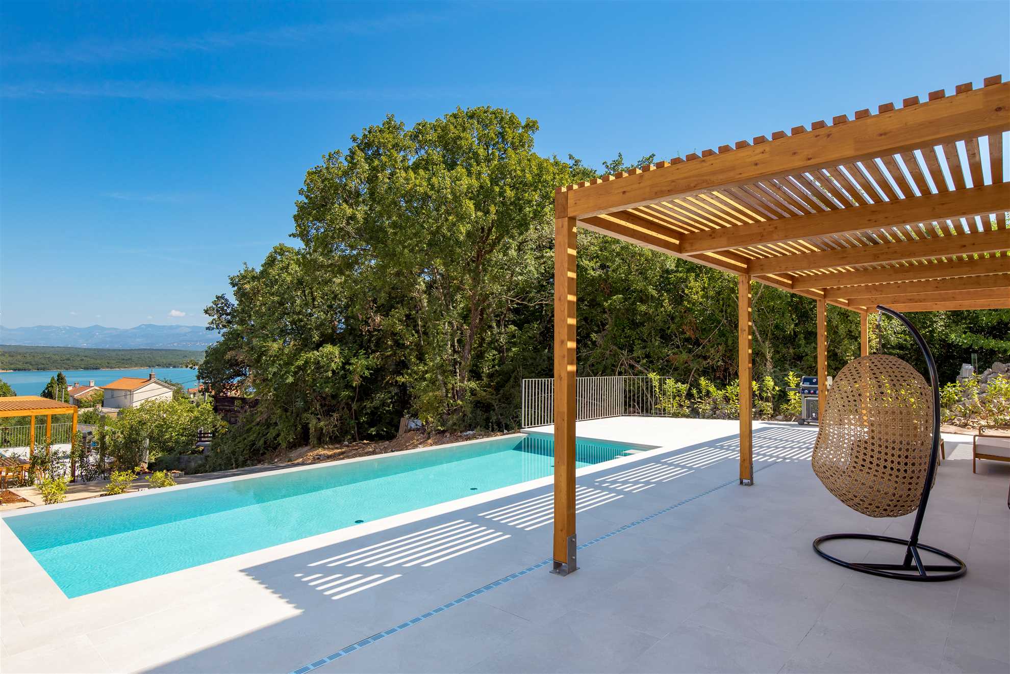 Outside, the villa's beautiful terrace is a true highlight. Here, guests can relax by the private infinity pool, soak up the sun on comfortable loungers, or dine while taking in the panoramic sea views. The outdoor area also includes a barbecue, ideal for evening gatherings and creating memorable culinary experiences.